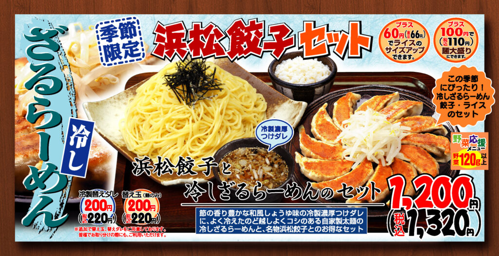 この季節にぴったり!節の香り豊かな和風しょうゆ味の冷製濃厚つけダレに、よく冷えたのど越しよくコシのある自家製太麺の冷しざるらーめんと、名物浜松餃子とのお得なセットです。