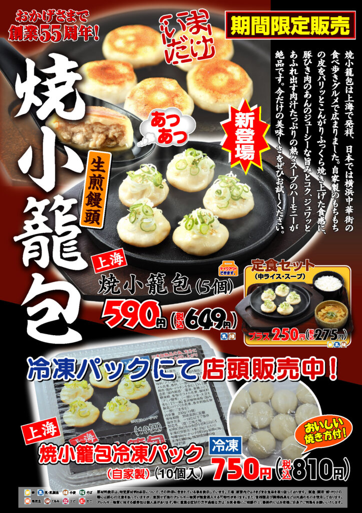 焼小籠包は上海で発祥、日本では横浜中華街の食べ歩きグルメで広まりました。自家製のもちもちの皮をパリッとこんがりふっくら焼き上げた食感に、豚ひき肉のあんのジューシーな旨みとコク、ジュワッとあふれ出す肉汁たっぷりの熱々スープのハーモニーが絶品です。今だけの美味しさをぜひお試しください。