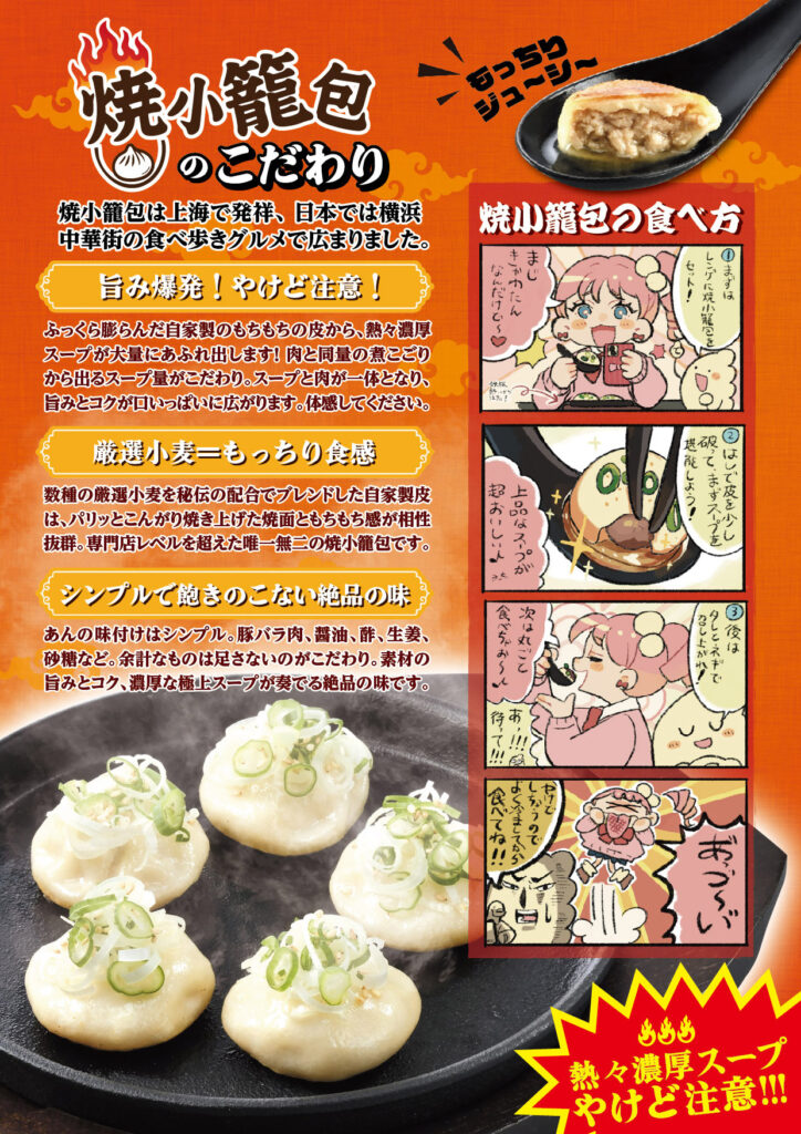 アップロードされた「焼小籠包(焼きショウロンポウ)のこだわり・食べ方」のチラシ内容を書き起こしました。